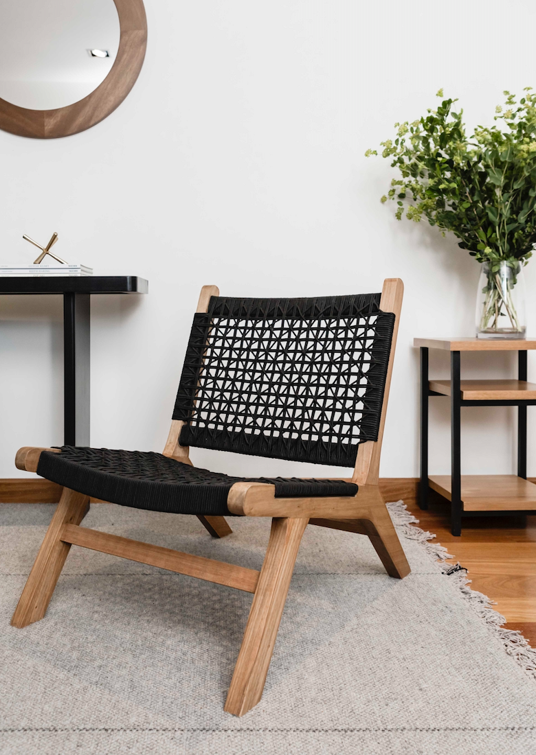 Material: Madera cachimbo maciza, lustre natural. Las estructura es de madera laqueado color negro mate.