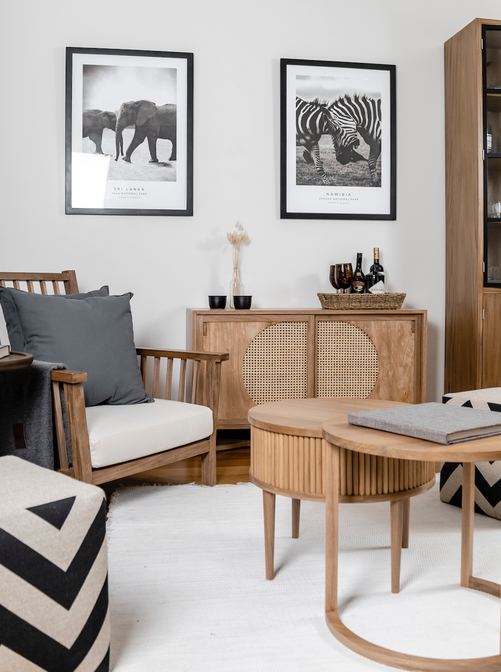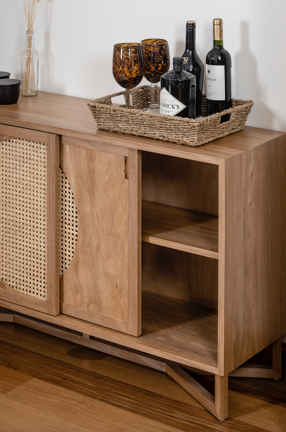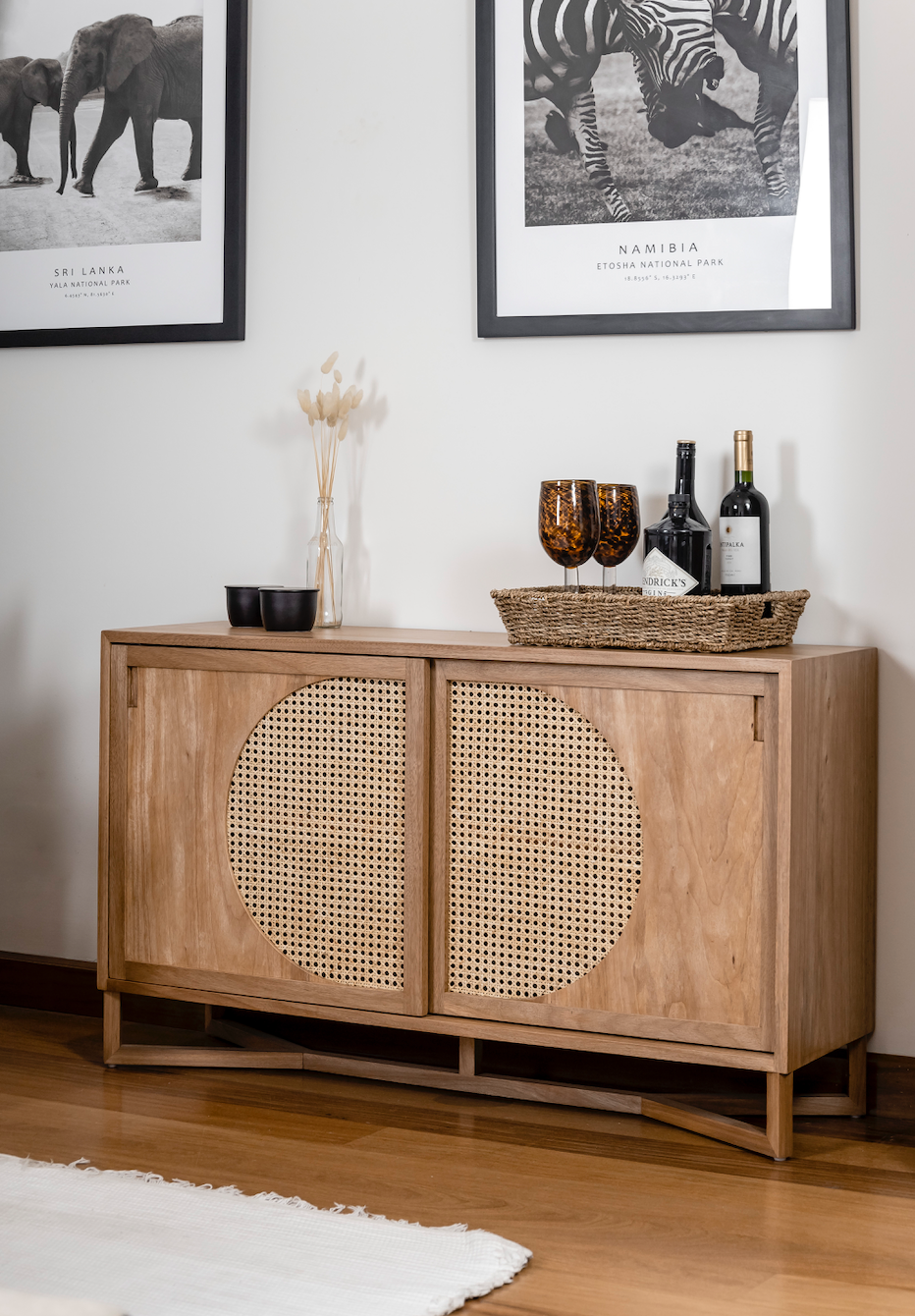 Material: Madera cachimbo maciza natural, lustre mate y puertas tejido rattan natural