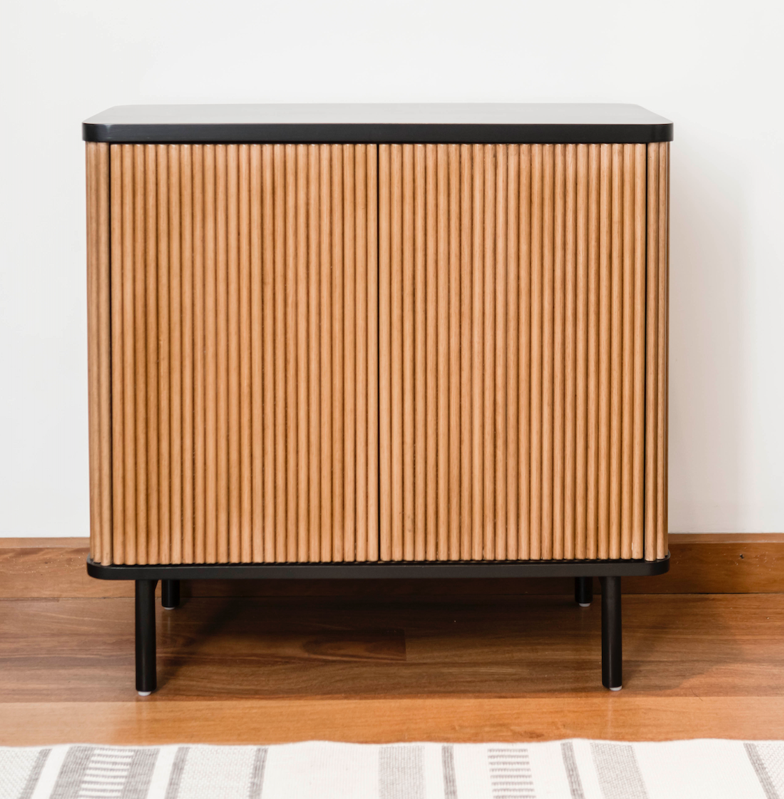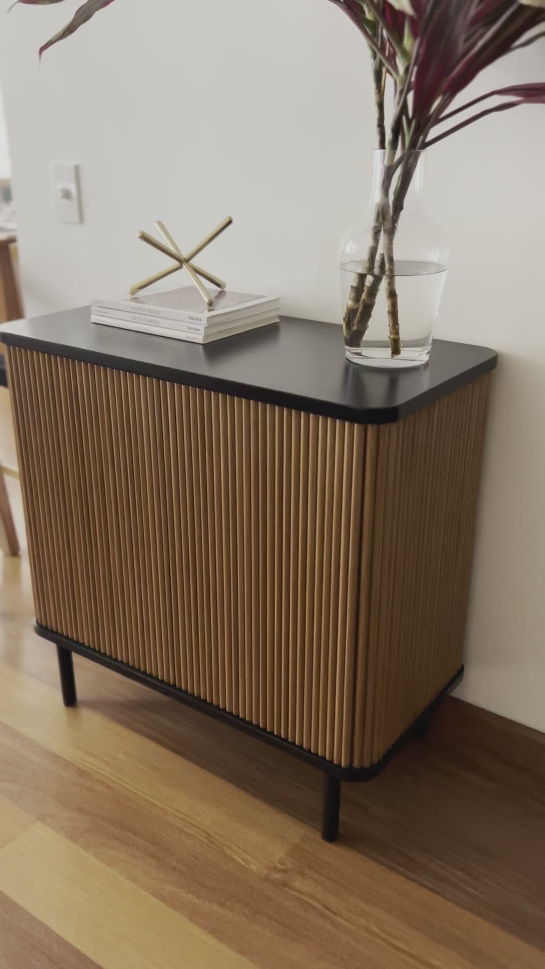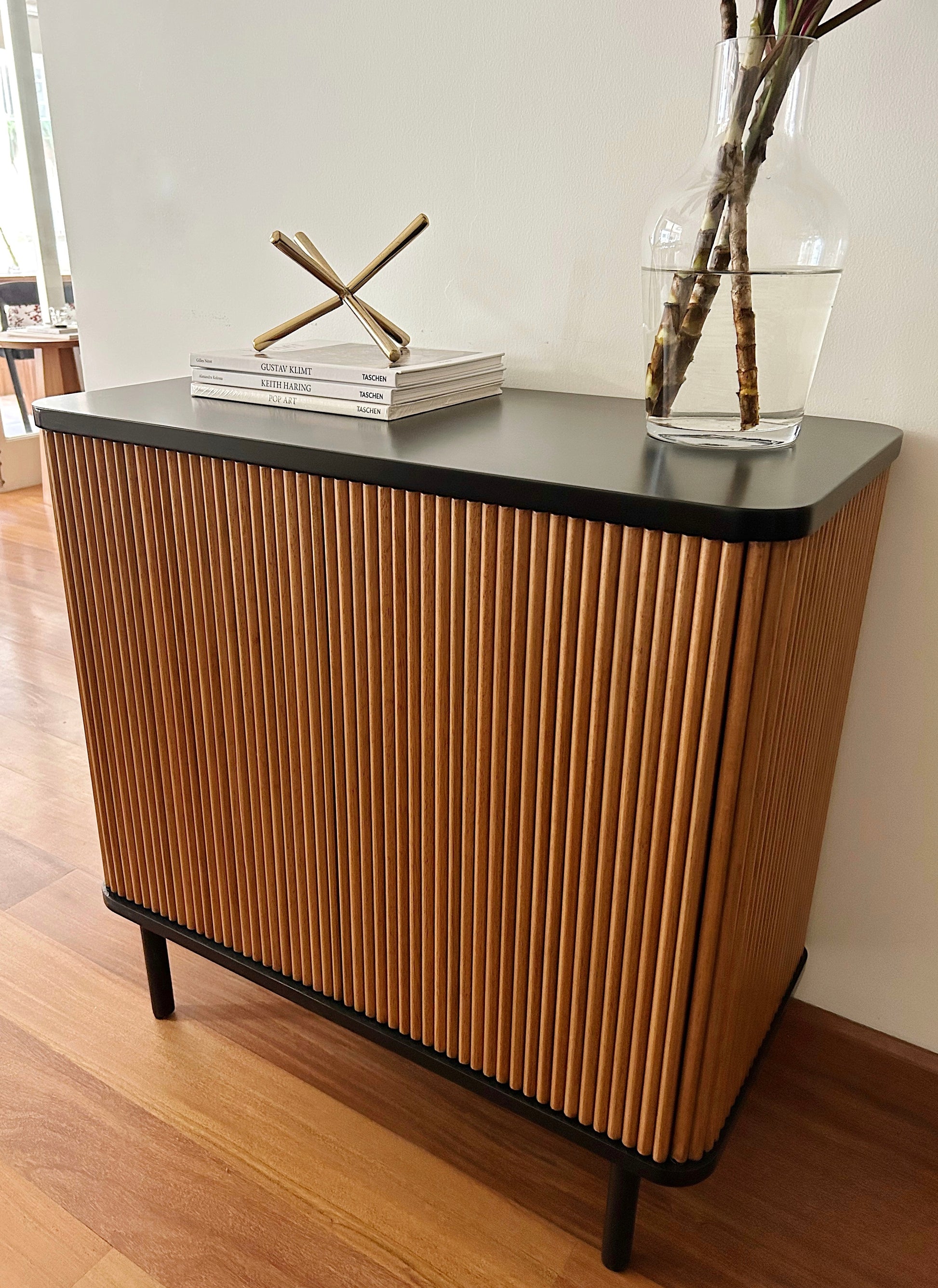 Material: Madera cachimbo maciza natural, lustre mate. La tapa y patas están pintadas de negro mate.