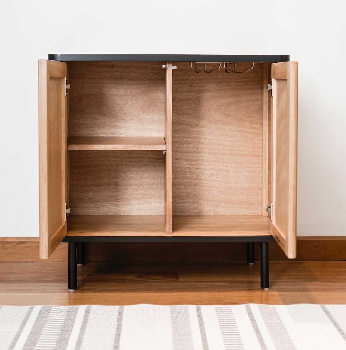 Detalles constructivos: En el interior presenta una repisa movil y soporte para colgar copas.