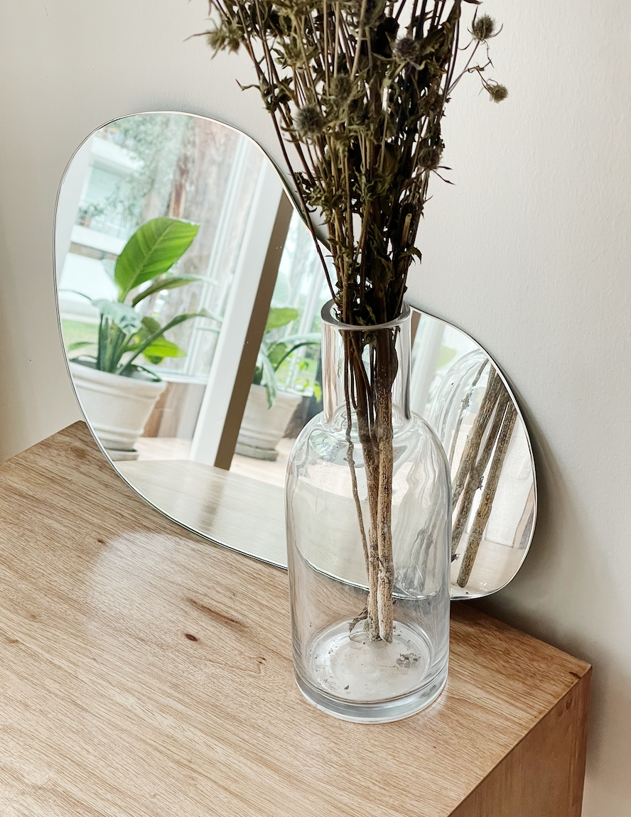 Material: Espejo belga con placa de mdf atrás para protección y fácil colocación (simplemente se coloca un clavo en la pared y se cuelga).